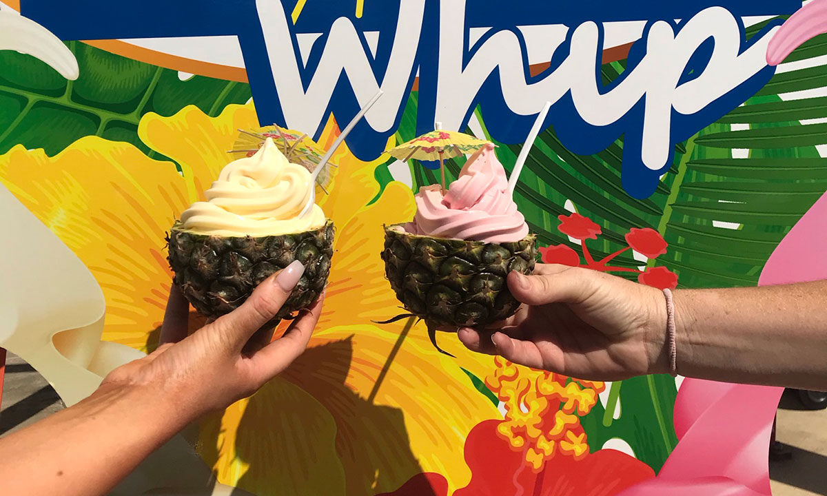 The Dole Whip trucks are all about sensational pineapple goodness, whipped into soft‑serve swirls with strawberry, mango or watermelon for a taste of pure sunshine. Add on sweet “nachos” with soft serve, fresh pineapple, sprinkles and waffle cone chips, or pineapples filled with fluffy pineapple goodness for a tropical treat.