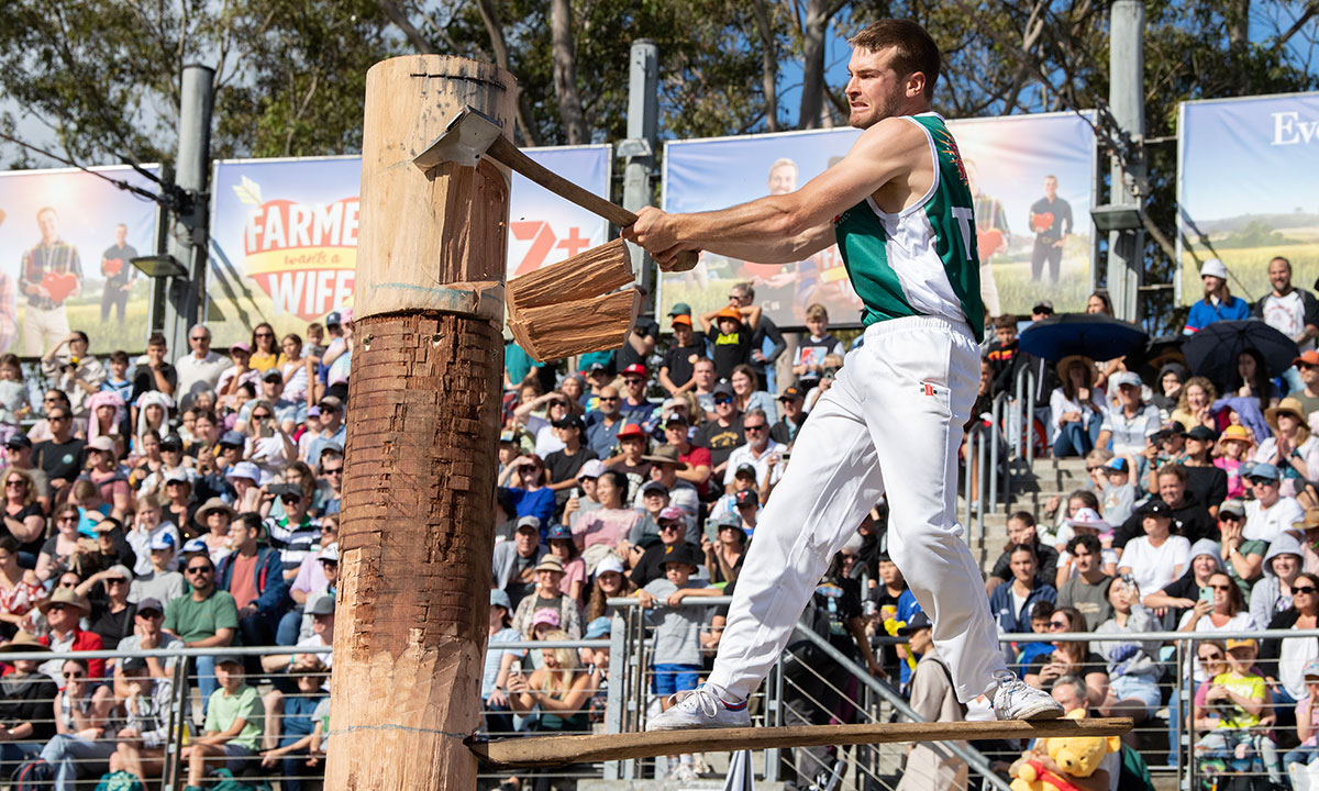 In the tree felling competition the competitor chops notches in a tree/log and inserts a board into the cut. The board is then used as a platform in order to cut higher up the tree. This is done three times in order to get to the top of the tree and cut, before coming back down and starting again on the opposite side – eventually the competitor is back at the top and cutting all the way through so that the top of the tree falls to the ground.